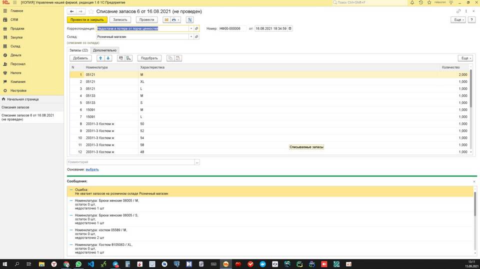 - Недостаточный остаток - попытка списать больше, чем есть на складе